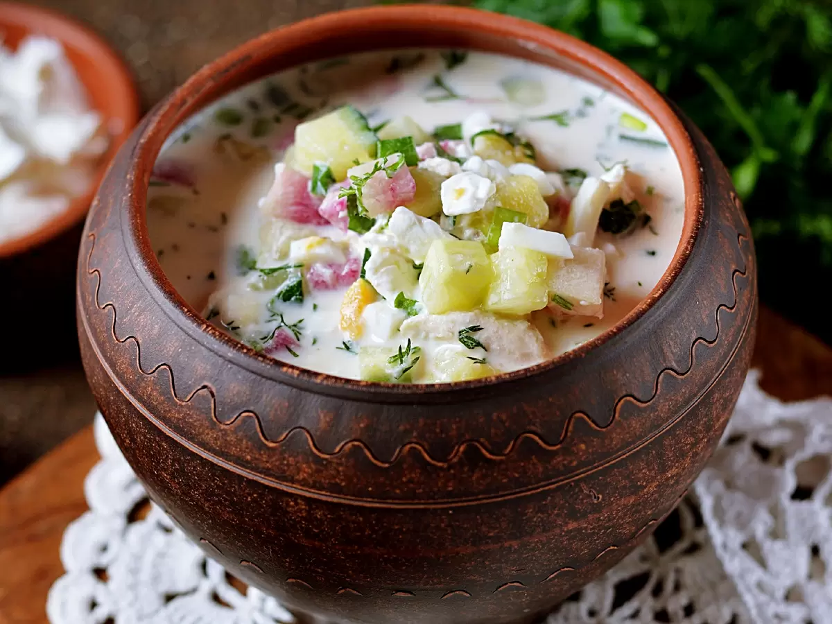 Вместо привычного кефира используется творог и сметана, что делает блюдо более плотным и сытным. Наполненное овощами и приправленное любимыми специями, это сочетание не оставит равнодушным. Готовить окрошку можно на бульоне или газированной воде, в зависимости от наличия продуктов в холодильнике.