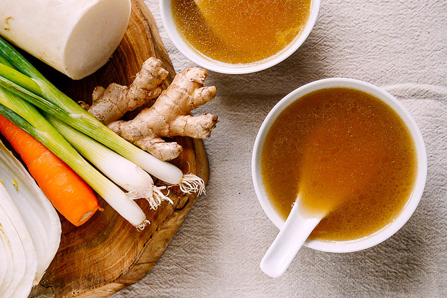 Сначала тщательно промыть шиитаке и замочить их в теплой воде на 20 минут. Морковь и дайкон нарезать крупными кусками, а зеленый лук завязать в узел.Разогреть духовой шкаф до 190 °C. Пекинскую капусту разрезать вдоль на две половинки, выложить на противень, сбрызнуть растительным маслом и запекать около 25 минут.В кастрюле на среднем огне разогреть столовую ложку масла, добавить нарезанный имбирь и зубчики чеснока, предварительно разрезанные пополам. Обжаривать около 2 минут, следя за тем, чтобы чеснок не подгорел.В кастрюлю добавить лук, морковь, дайкон, зеленый лук, комбу и шиитаке, залить водой. Как только капуста будет готова, добавить её в бульон.Довести до кипения, уменьшить огонь до минимума и варить на маленьком огне около 4 часов.После этого процеживаем бульон и приправляем солью по вкусу. Бульон готов!Хранение: